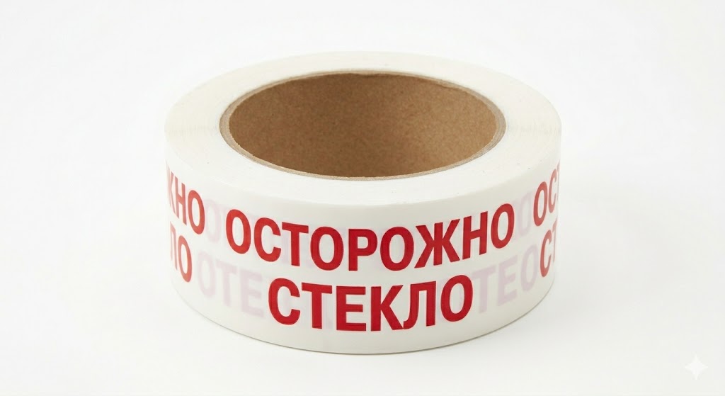 Упаковочный скотч с предупреждающей надписью для безопасной транспортировки.